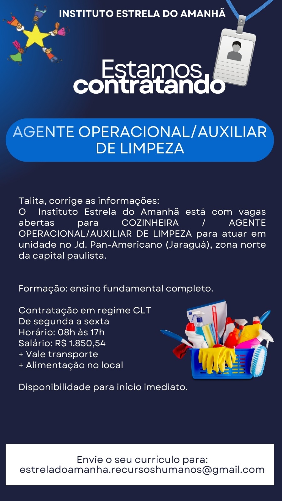 AGENTE OPERACIONAL/AUXILIAR DE LIMPEZA Talita, corrige as informações:O Instituto Estrela do Amanhã está com vagas abertas para COZINHEIRA / AGENTE OPERACIONAL/AUXILIAR DE LIMPEZA para atuar em unidade no Jd. Pan-Americano