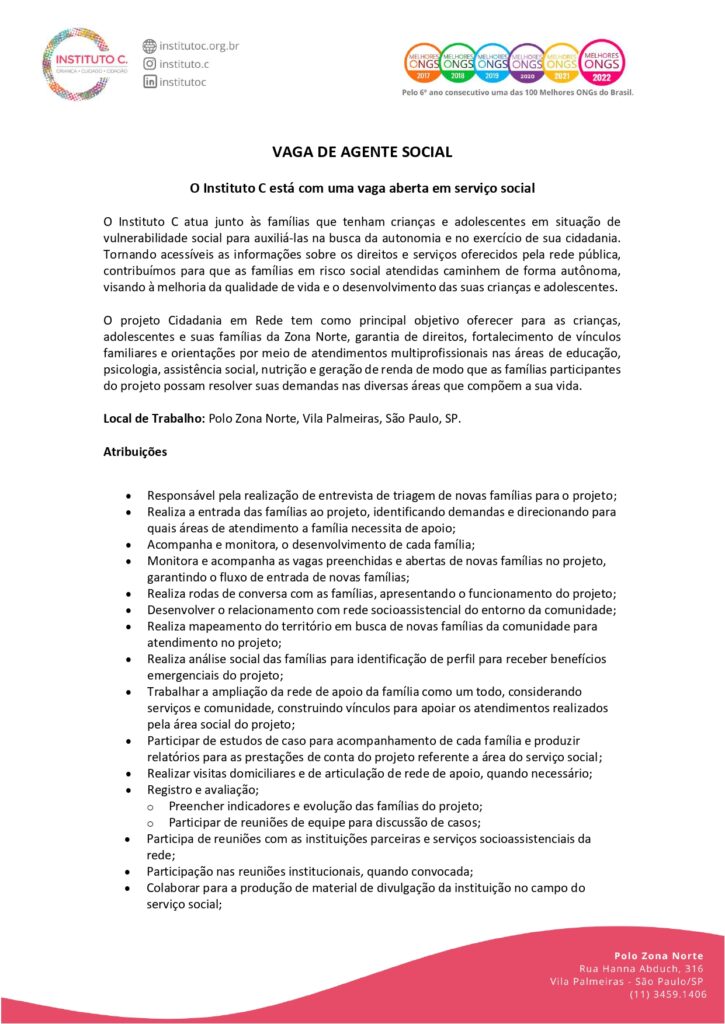 O Educandário Sagrada Família abre vaga para orientador socioeducativo. Horário: 2º a 6ª das 12h às 16h. Local: Rua Barão