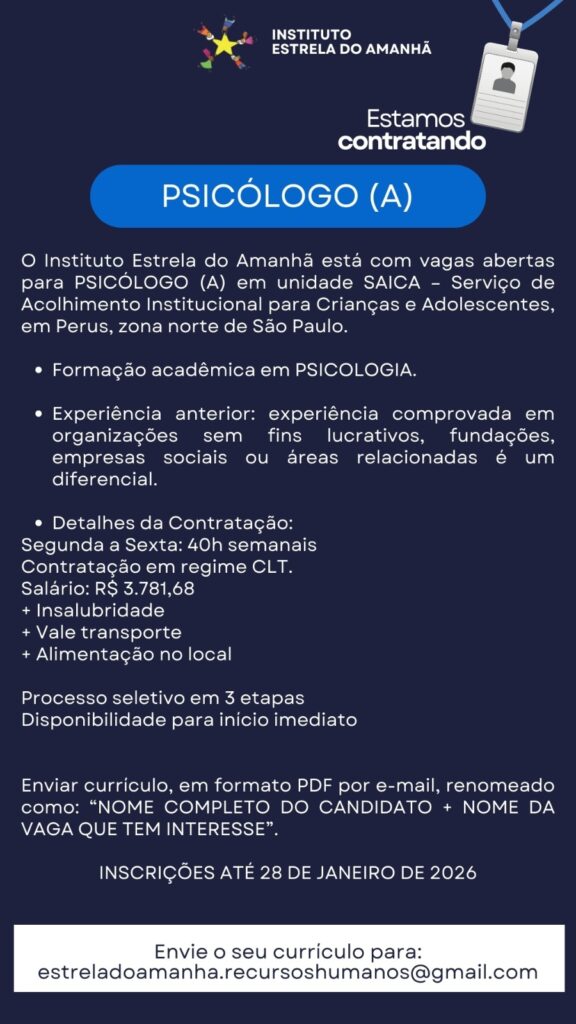 PSICÓLOGO (A) O Instituto Estrela do Amanhã está com vagas abertas para PSICÓLOGO (A) em unidade SAICA – Serviço de