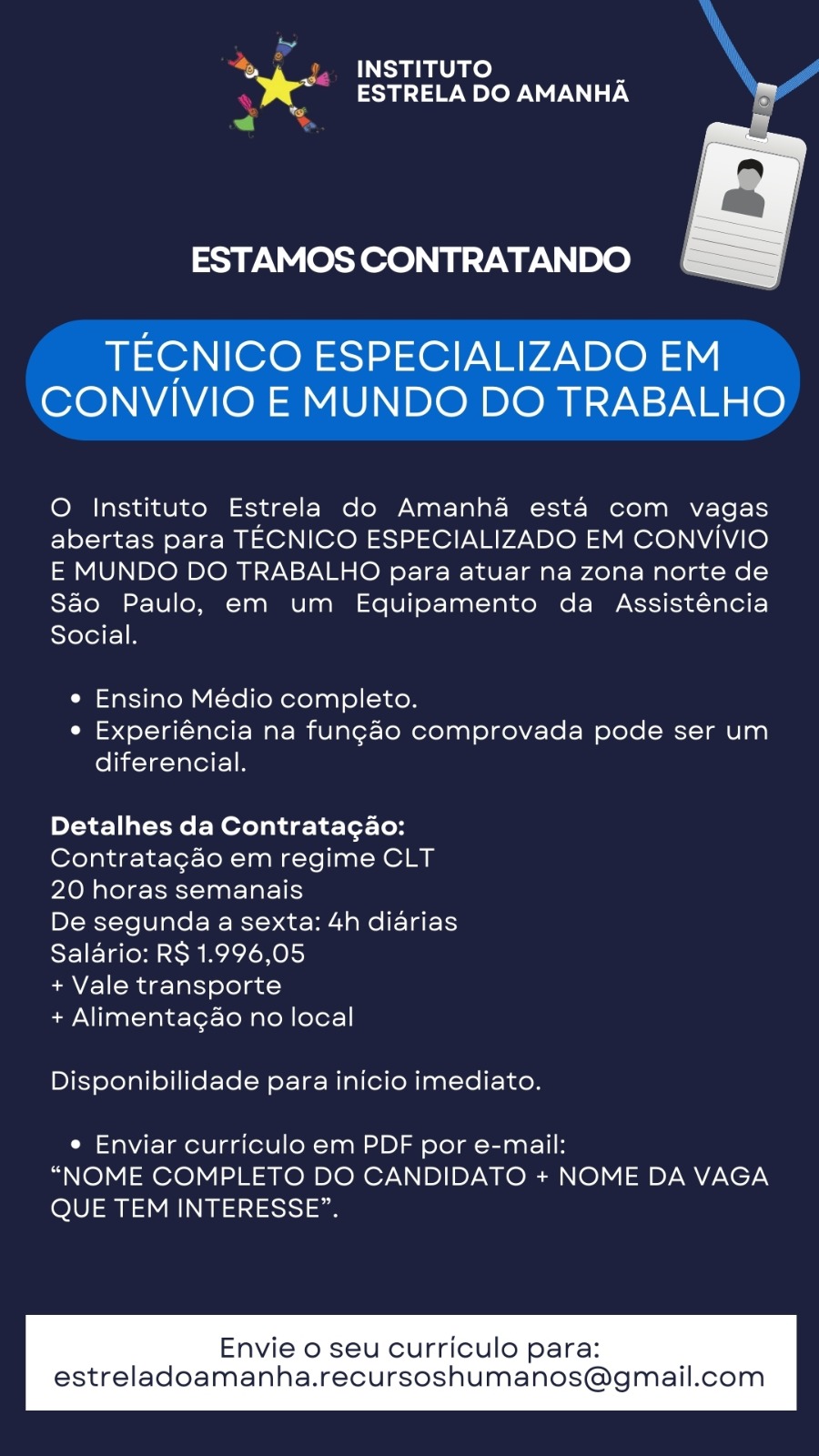 TÉCNICO ESPECIALIZADO EMCONVÍVIO E MUNDO DO TRABALHO O Instituto Estrela do Amanhã está com vagas abertas para TÉCNICO ESPECIALIZADO EM CONVÍVIO E MUNDO DO TRABALHO para atuar na zona norte