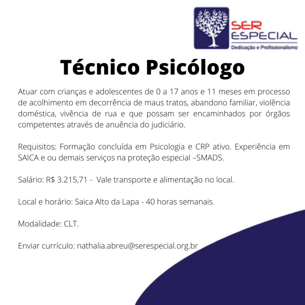 O Instituto Vida Contrata Técnico Psicólogo para atuar em NPJ (Núcleo de Proteção Jurídico Social e Apoio Psicológico) na Zona