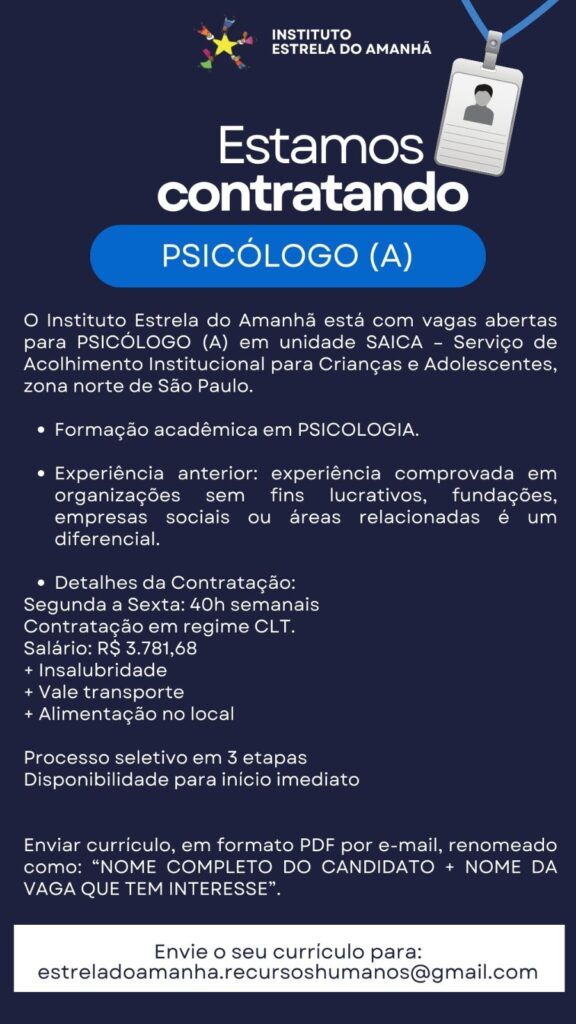 PSICÓLOGO (A) O Instituto Estrela do Amanhã está com vagas abertas para PSICÓLOGO (A) em unidade SAICA – Serviço de