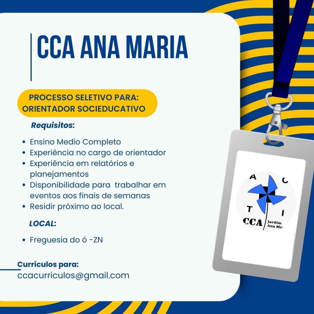 📢 VAGA ABERTA | ORIENTADOR(A) SOCIOEDUCATIVO(A)Estação Cidadania – São Paulo/SP 📍 Local: Estação Cidadania⏰ Jornada: 40 horas semanais💼 Regime: CLT💰