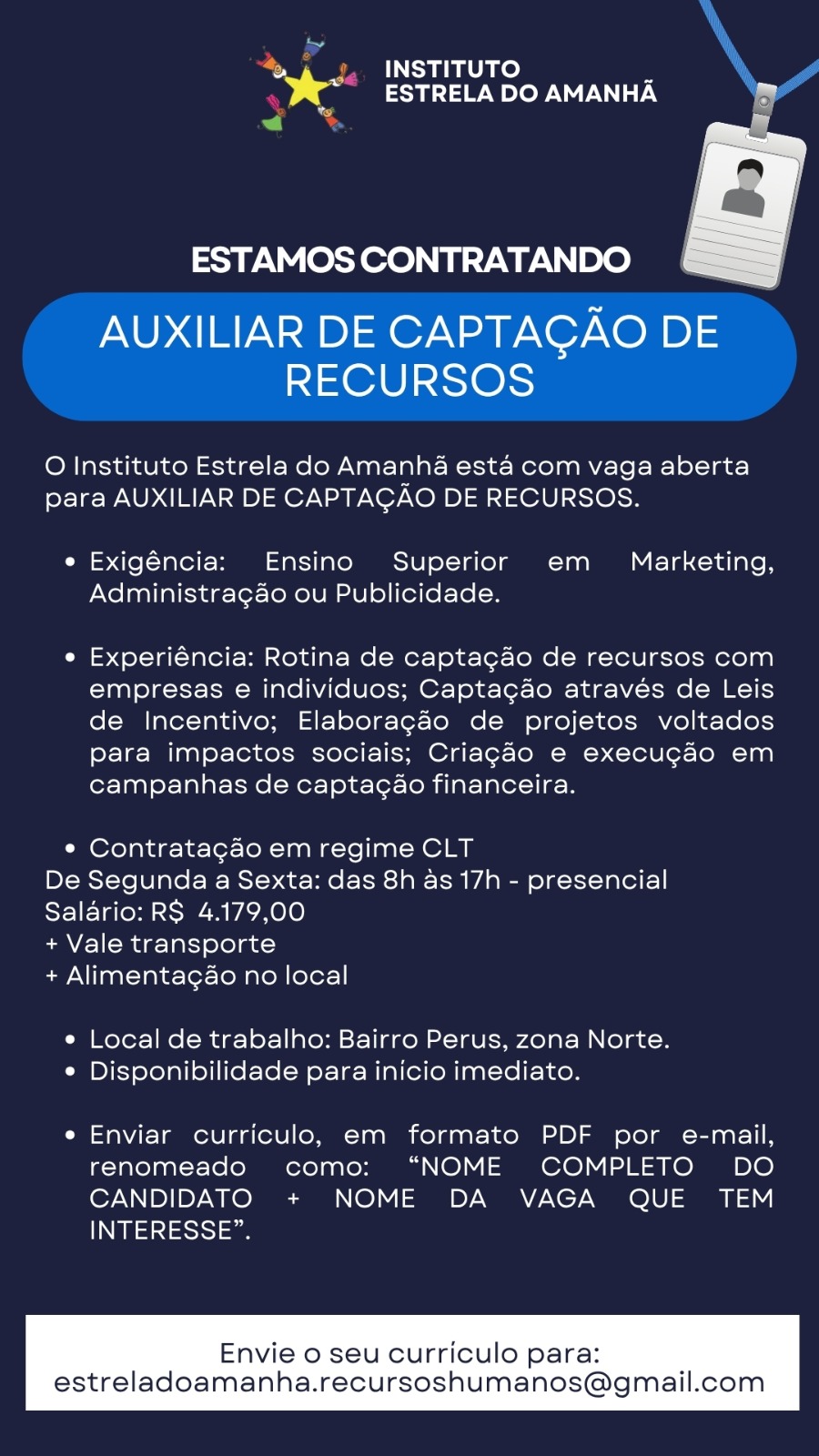 AUXILIAR DE CAPTAÇÃO DE RECURSOS O Instituto Estrela do Amanhã está com vaga aberta para AUXILIAR DE CAPTAÇÃO DE RECURSOS. Exigência: Ensino Superior em Marketing, Administração ou Publicidade. Experiência: Rotina