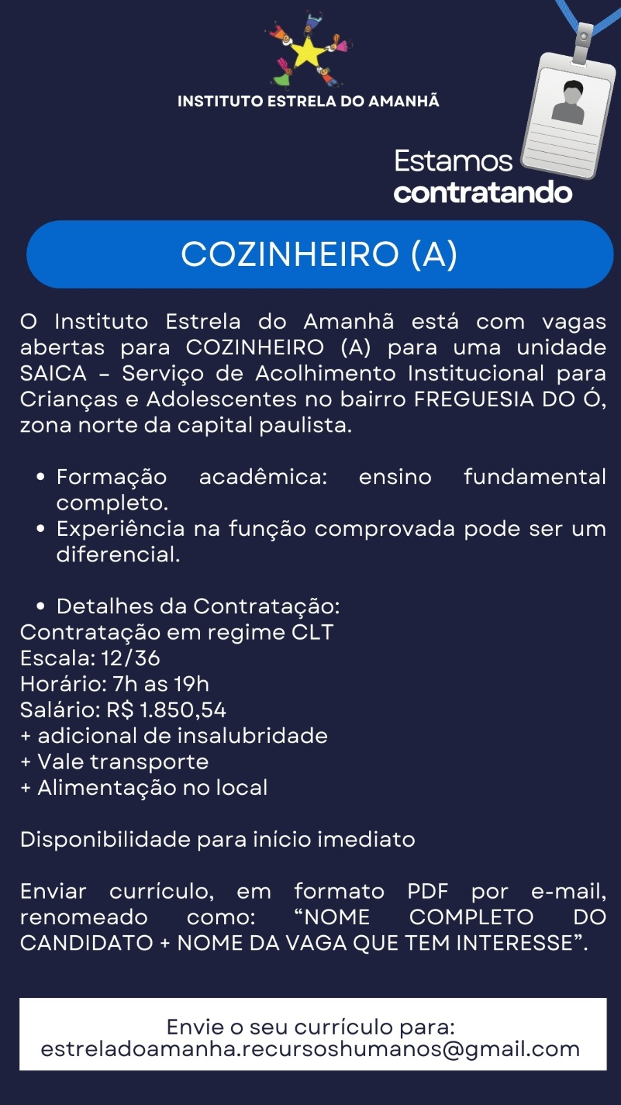 COZINHEIRO (A) O Instituto Estrela do Amanhã está com vagas abertas para COZINHEIRO (A) para uma unidade SAICA – Serviço de Acolhimento Institucional para Crianças e Adolescentes no bairro FREGUESIA