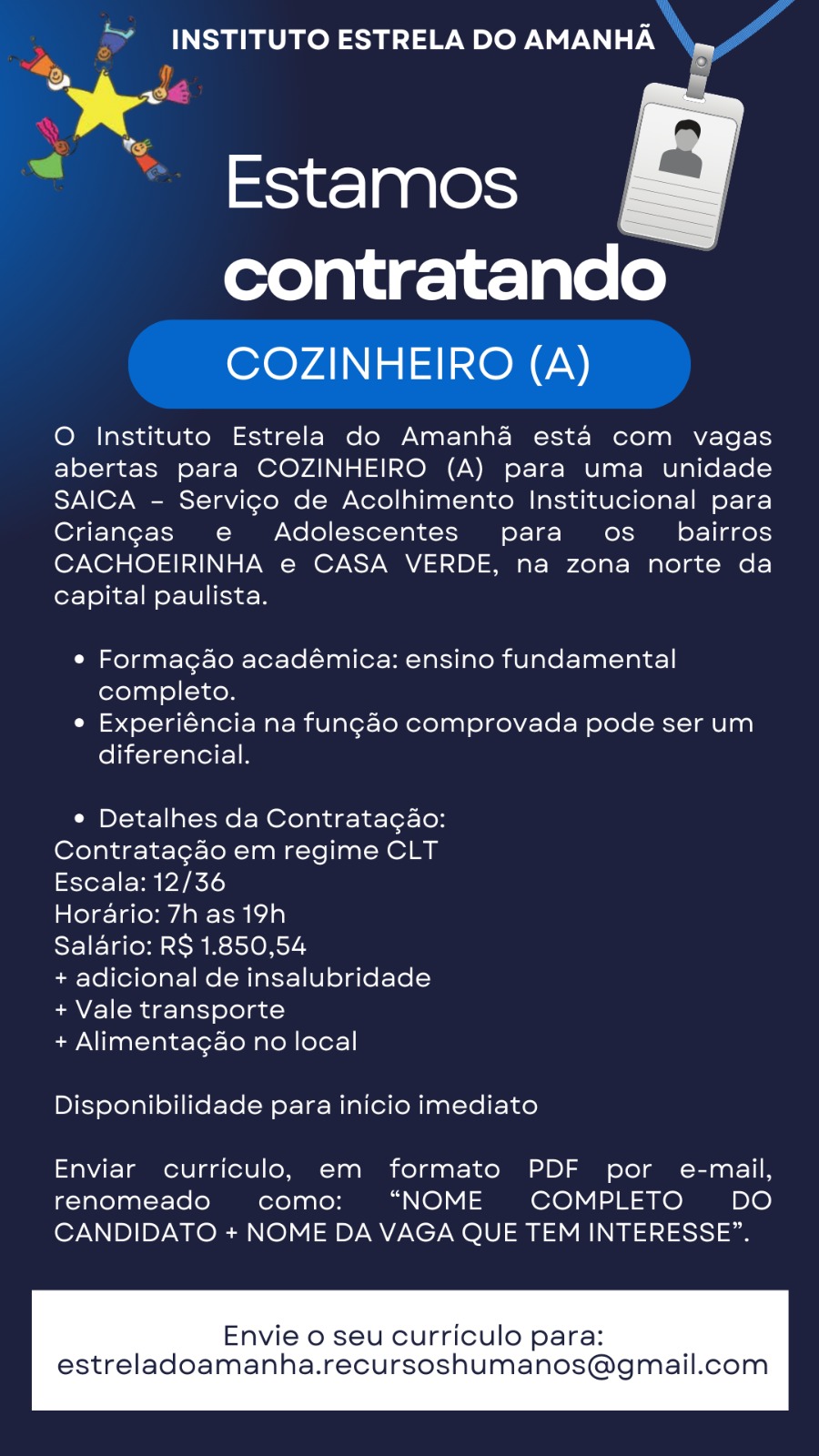 COZINHEIRO (A) O Instituto Estrela do Amanhã está com vagas abertas para COZINHEIRO (A) para uma unidade SAICA – Serviço de Acolhimento Institucional para Crianças e Adolescentes para os bairros