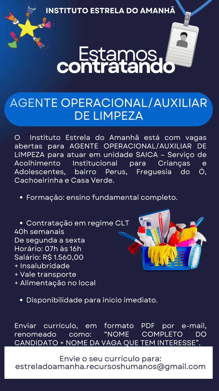O Instituto Estrela do Amanhã está com vagas abertas para AGENTE OPERACIONAL/AUXILIAR DE LIMPEZA para atuar em unidade SAICA – Serviço de Acolhimento Institucional para Crianças e Adolescentes, bairro Perus,
