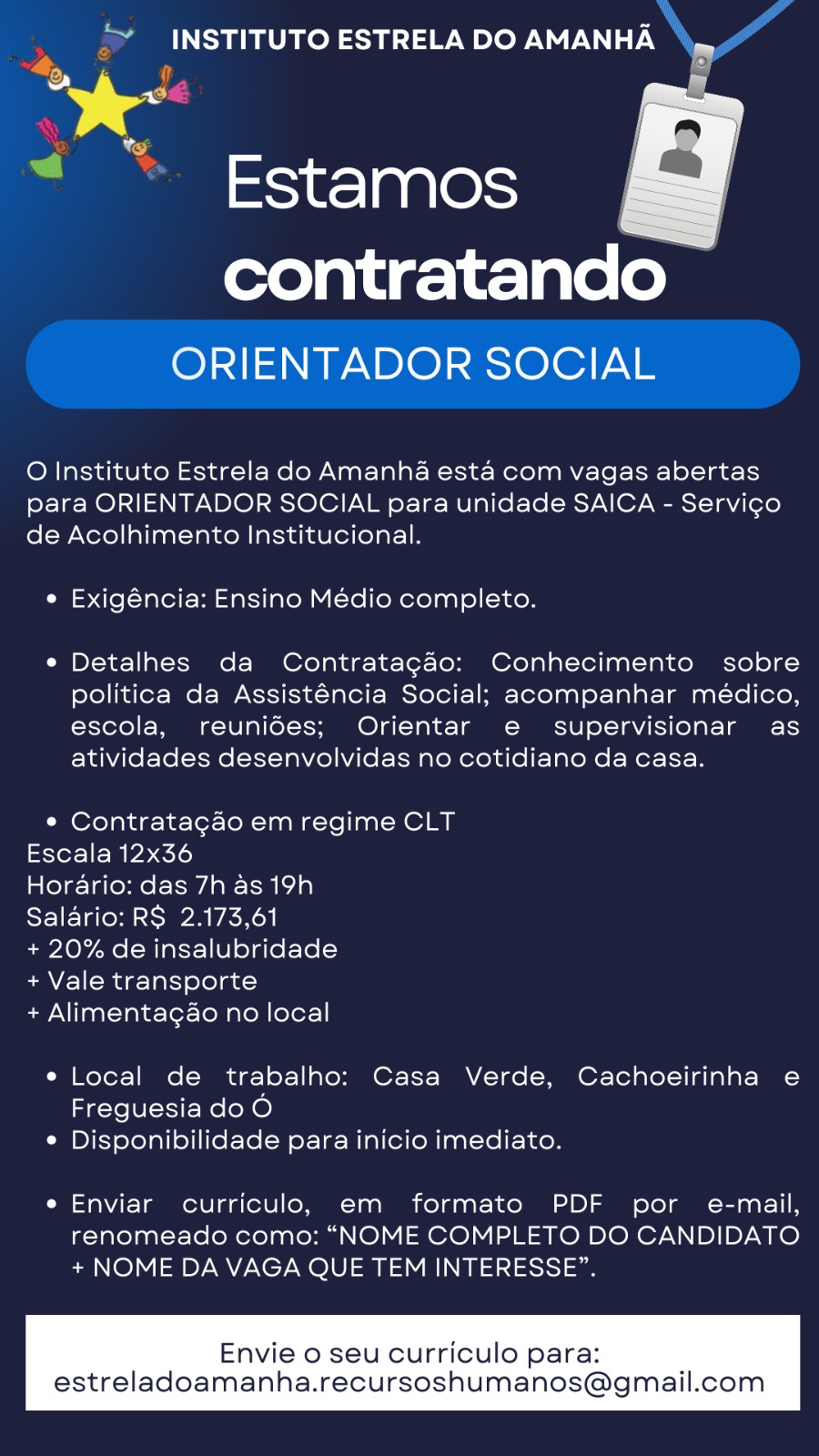 O Instituto Estrela do Amanhã está com vagas abertas para ORIENTADOR SOCIAL para unidade SAICA – Serviço de Acolhimento Institucional. Exigência: Ensino Médio completo. Detalhes da Contratação: Conhecimento sobre política