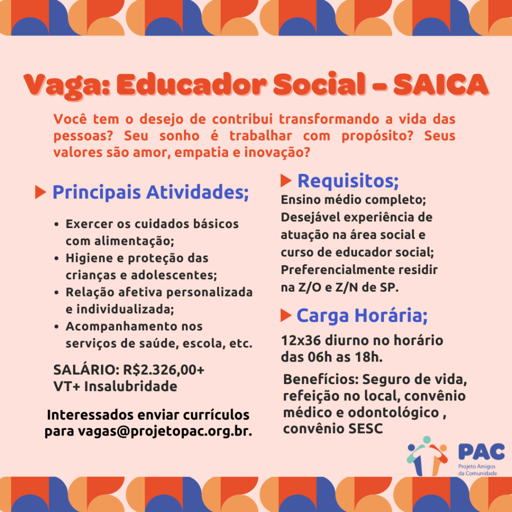 Estamos contratando ORIENTADOR(A) SOCIOEDUCATIVO para atuar em SAICA (Serviço de Acolhimento Institucional para Crianças e Adolescentes) A pessoa contratada será responsável por