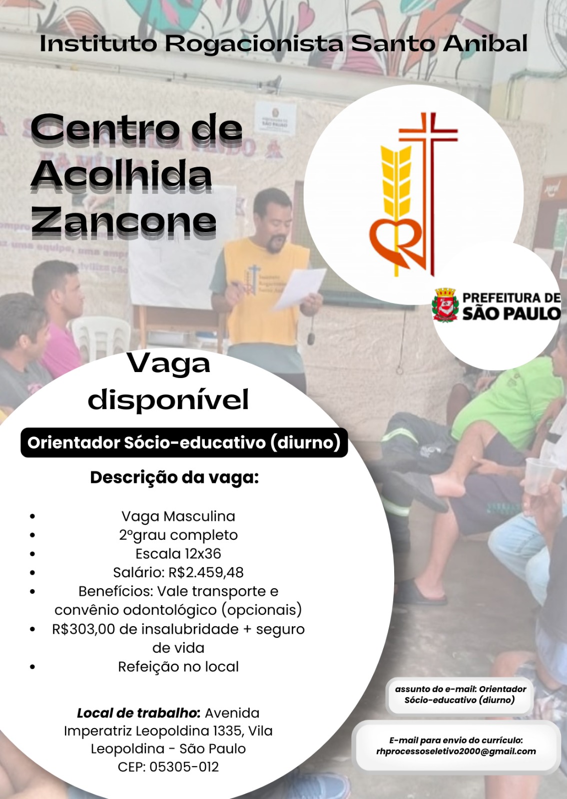 O Centro de Acolhida Albergue Zancone, está contratando Orientadores Socioeducativo/masculino para atuar na região da Zona Oeste- Vila Leopoldina. A vaga é destinada para profissional do sexo masculino e possuir