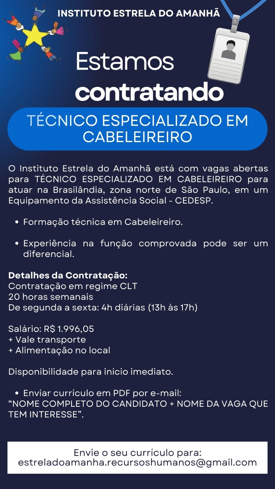 TÉCNICO ESPECIALIZADO EM CABELEIREIRO O Instituto Estrela do Amanhã está com vagas abertas para TÉCNICO ESPECIALIZADO EM CABELEIREIRO para atuar na Brasilândia, zona norte de São Paulo, em um Equipamento