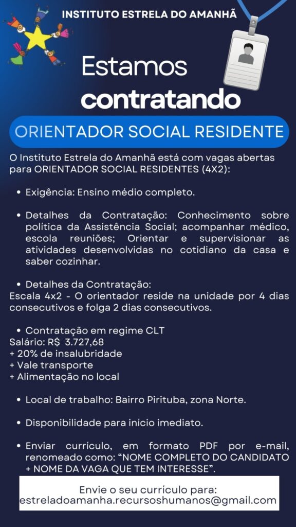 ORIENTADOR SOCIAL RESIDENTEO Instituto Estrela do Amanhã está com vagas abertas para ORIENTADOR SOCIAL RESIDENTES (4X2): Exigência: Ensino médio completo.