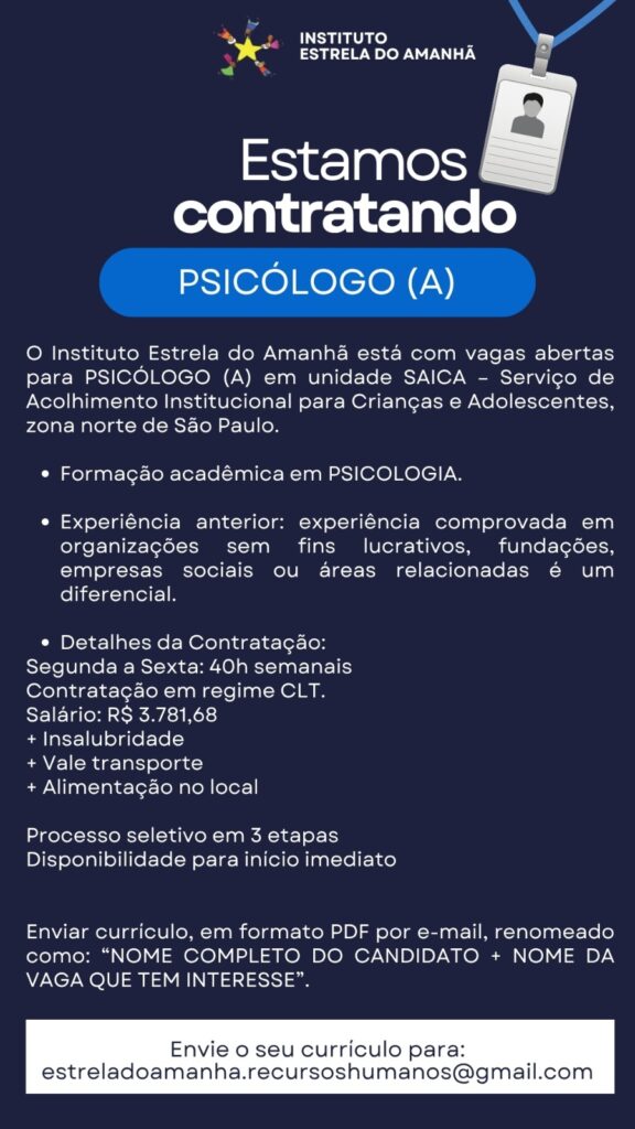Estamos contratando Psicólogo(a) Para uma unidade SAICA – Serviço de Acolhimento Institucional para Crianças e Adolescentes, zona norte de