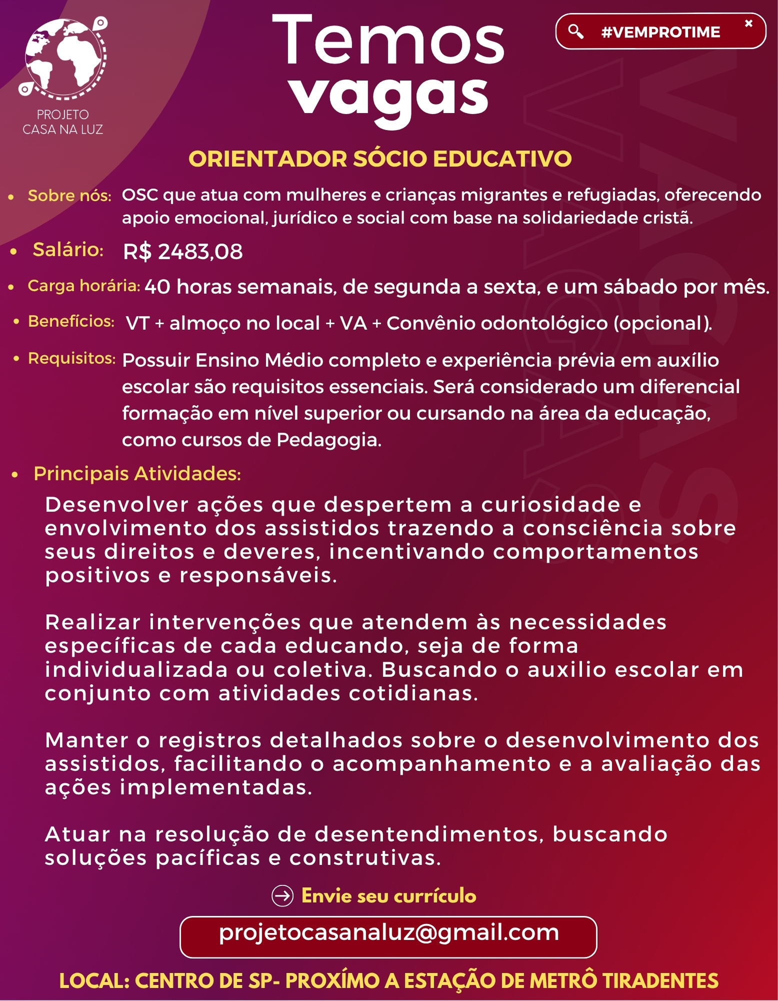 Sobre nós:OSC que atua com mulheres e crianças migrantes e refugiadas, oferecendo apoio emocional, jurídico e social com base na solidariedade cristã. Salário:R$ 2483,08 Carga horária:40 horas semanais, de segunda