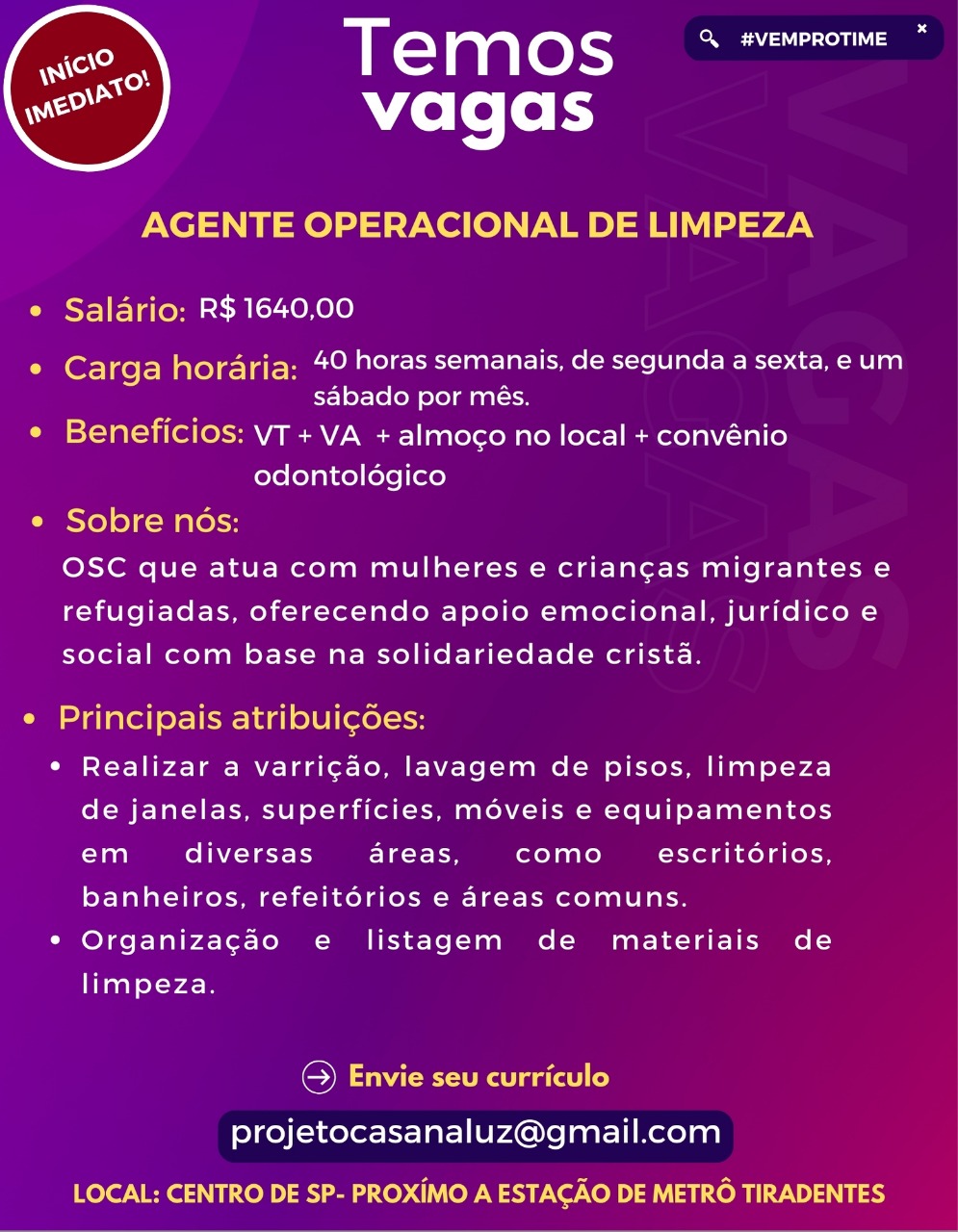 Contrata-se Auxiliar Operacional de Limpeza 12×36 Atuará na manutenção de limpeza de Centro de Acolhida. Local de trabalho fica próximo à estação Tamanduateí, Linha Verde, no bairro Vila Independência. Salario: