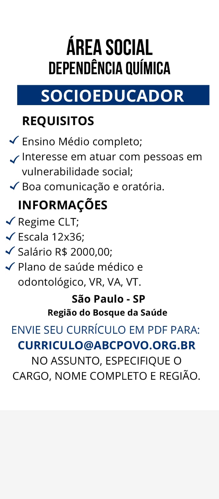 Socio Educador /unidade de dependência química regime CLT 12/36 salario 2000,00/plano de saúde/odontológico/VR,VA//VT