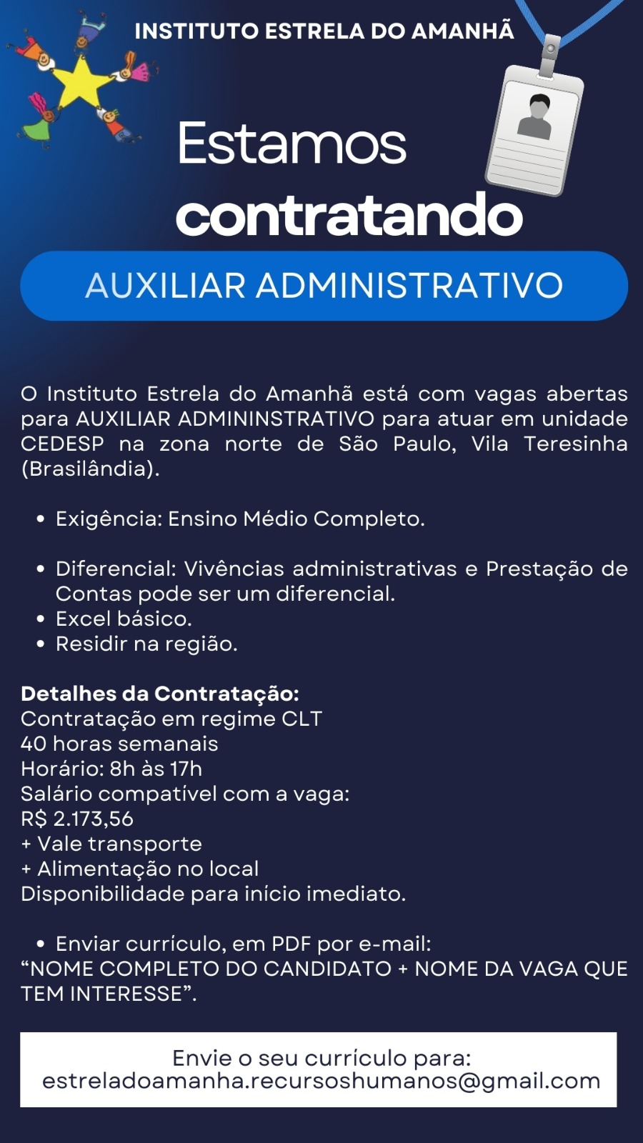 AUXILIAR ADMINISTRATIVO O Instituto Estrela do Amanhã está com vagas abertas para AUXILIAR ADMININSTRATIVO para atuar em unidade CEDESP na zona norte de São Paulo, Vila Teresinha (Brasilândia). Exigência: Ensino