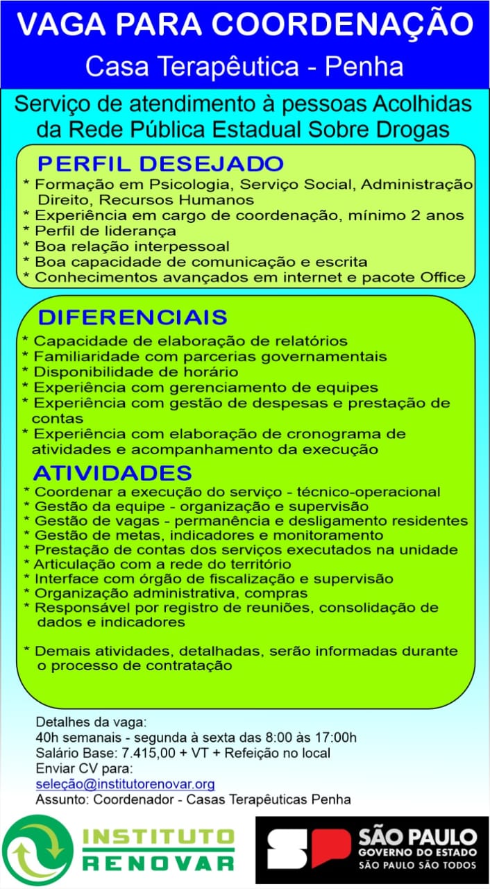 Formação em Psicologia, Serviço Social, Administração, Direito ou Recursos Humanos. Experiência em cargo de coordenação, mínimo 02 anos, perfil de liderança.