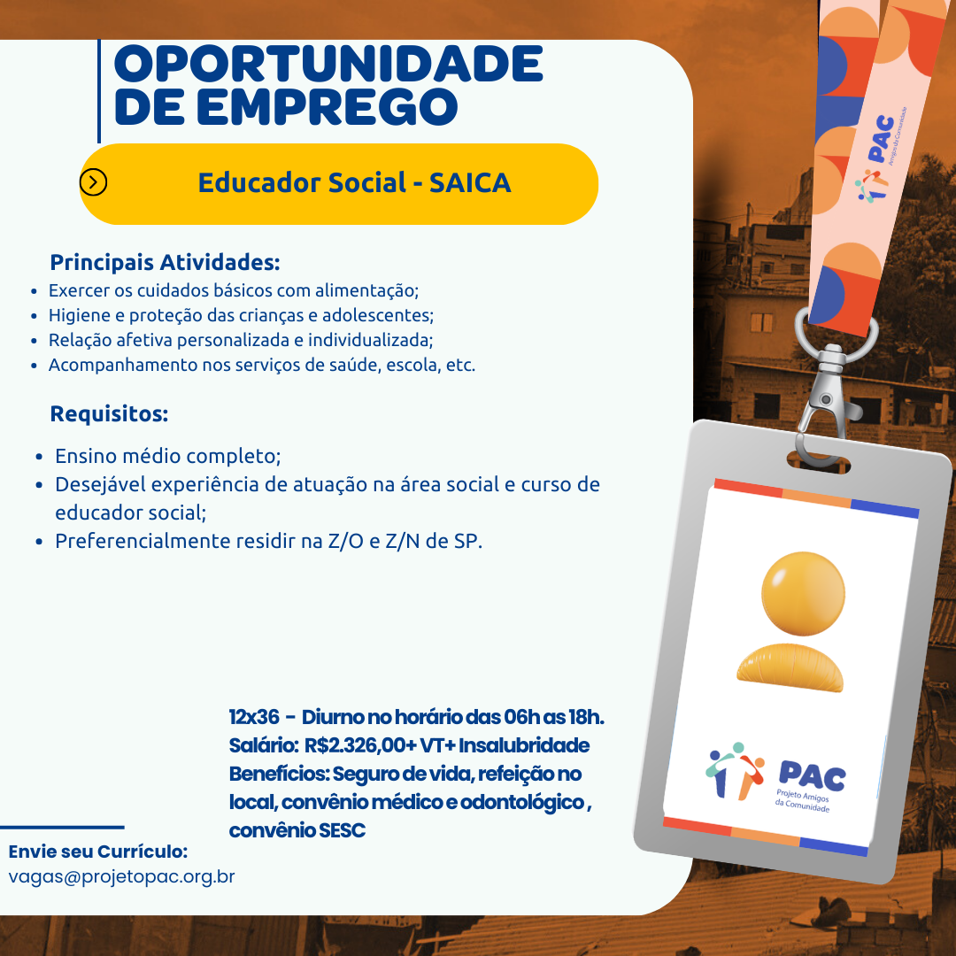 Vaga para Orientador Socio educativo Carga horária: 8:00 às 17:00h Segunda à Sexta Local: Parque Santa Madalena Salário: 2350,95 Vale transporteRefeição no local (café da manhã, almoço e café da tarde)