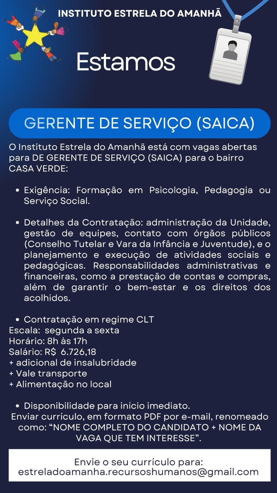 GERENTE DE SERVIÇO (SAICA) O Instituto Estrela do Amanhã está com vagas abertas para DE GERENTE DE SERVIÇO (SAICA) para o bairro CASA VERDE: Exigência: Formação em Psicologia, Pedagogia ou