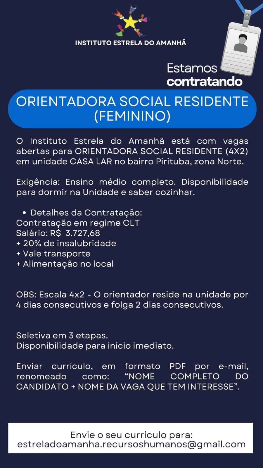 ORIENTADORA SOCIAL RESIDENTE(FEMININO) O Instituto Estrela do Amanhã está com vagas abertas para ORIENTADORA SOCIAL RESIDENTE (4X2) em unidade CASA LAR no bairro Pirituba, zona Norte. Exigência: Ensino médio completo.