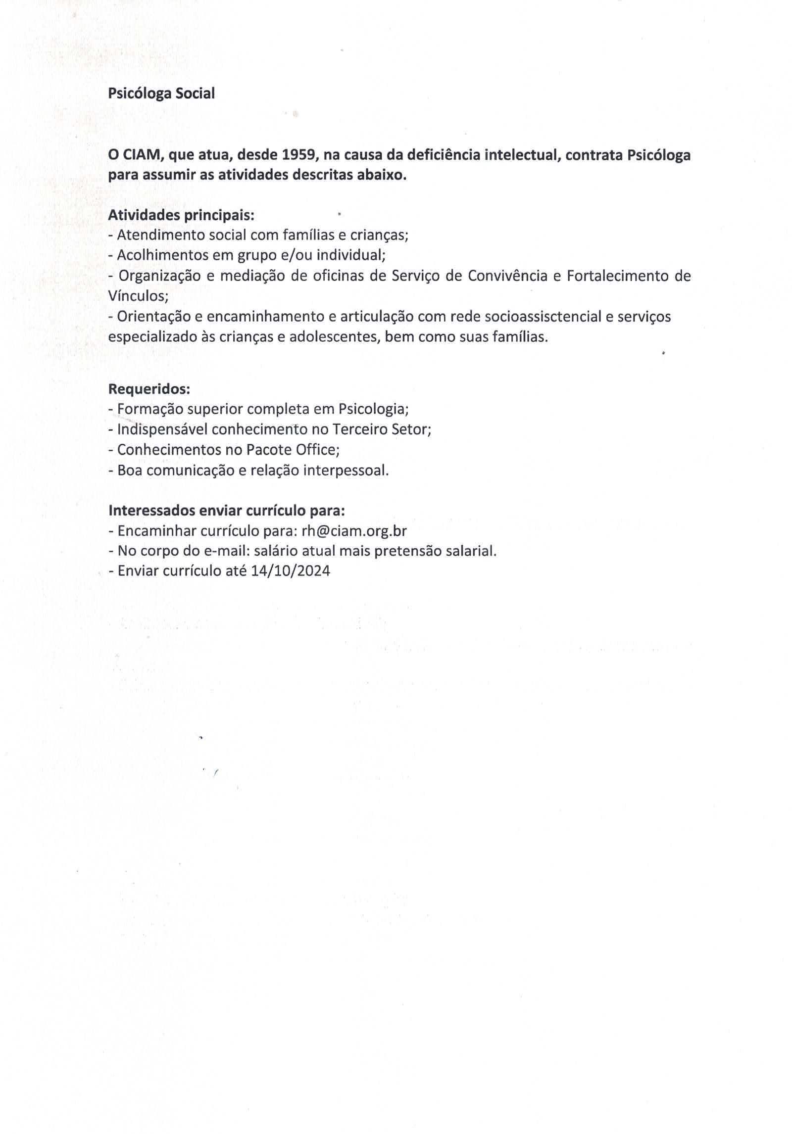 Psicóloga Social O CIAM, que atua, desde 1959, na causa da deficiência intelectual, contrata Psicóloga para assumir as atividades descritas abaixo. Atividades principais: – Atendimento social com
