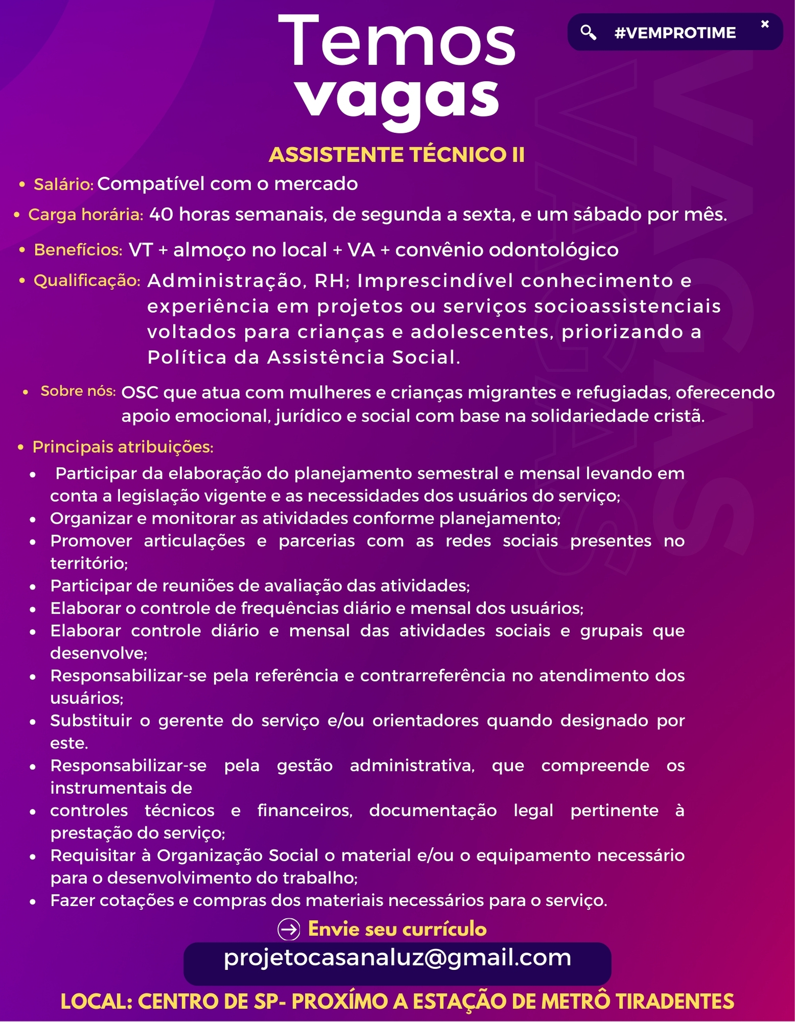 TEMOS VAGAASSISTENTE TÉCNICO II Salário:Compatível com o mercado Carga horária:40 horas semanais, de segunda a sexta, e um sábado por mês. Benefícios:VT + almoço no local + VA + convênio