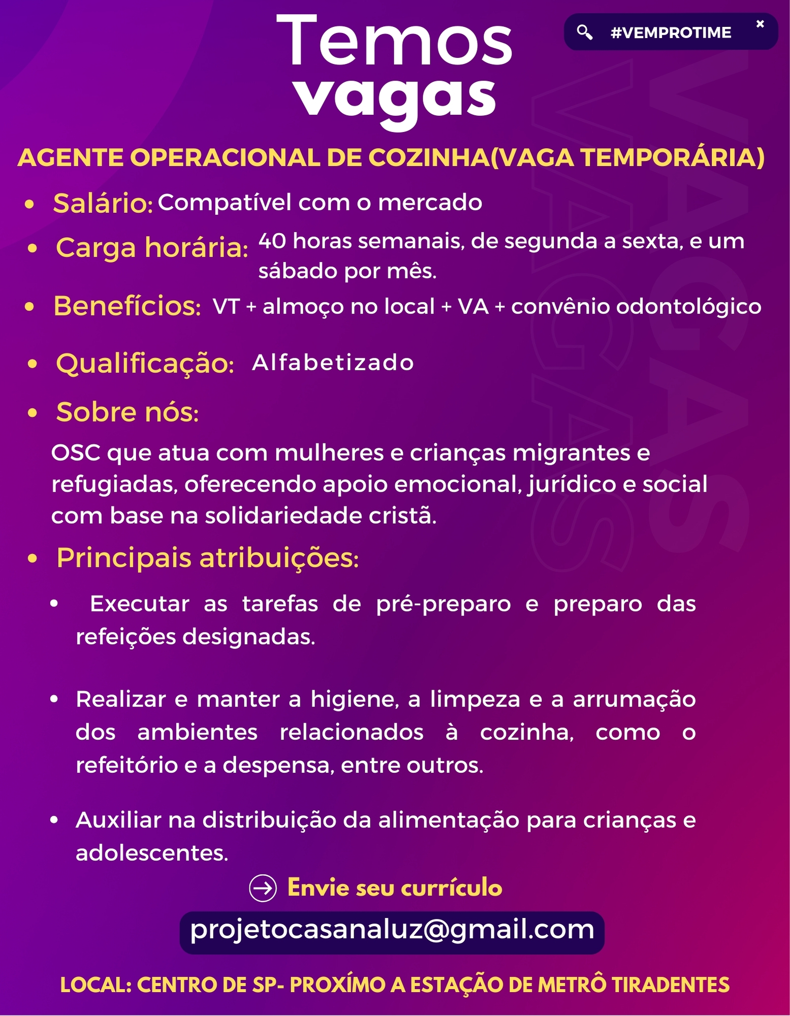 TEMOS VAGAS!! AGENTE OPERACIONAL DE COZINHA(VAGA TEMPORÁRIA) Salário:Compatível com o mercado Carga horária:40 horas semanais, de segunda a sexta, e um sábado por mês. Benefícios:VT + almoço no local +