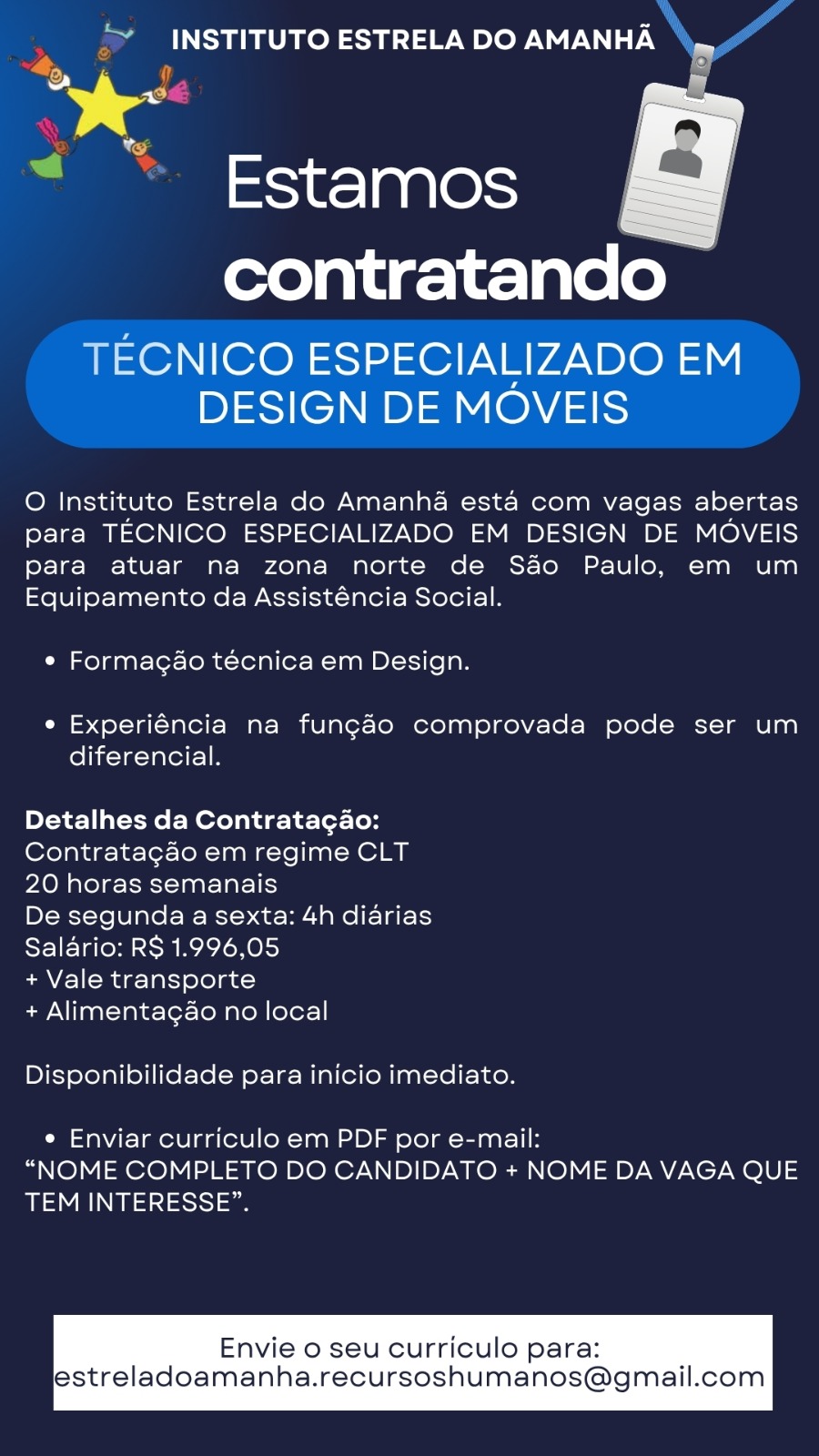 TÉCNICO ESPECIALIZADO EMDESIGN DE MÓVEIS O Instituto Estrela do Amanhã está com vagas abertas para TÉCNICO ESPECIALIZADO EM DESIGN DE MÓVEIS para atuar na zona norte de São Paulo, em
