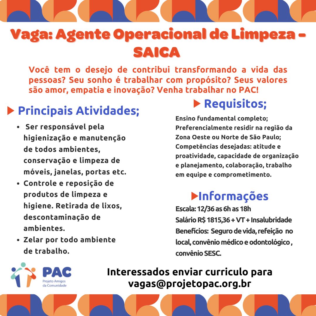Estamos contratando AGENTE OPERACIONAL (ÁREA DA LIMPEZA) para atuar em SAICA – Serviço de Acolhimento Institucional para Crianças e Adolescentes. ATIVIDADES: Realizar higienização, limpeza, organização e manutenção do espaço; Lavagem de roupa