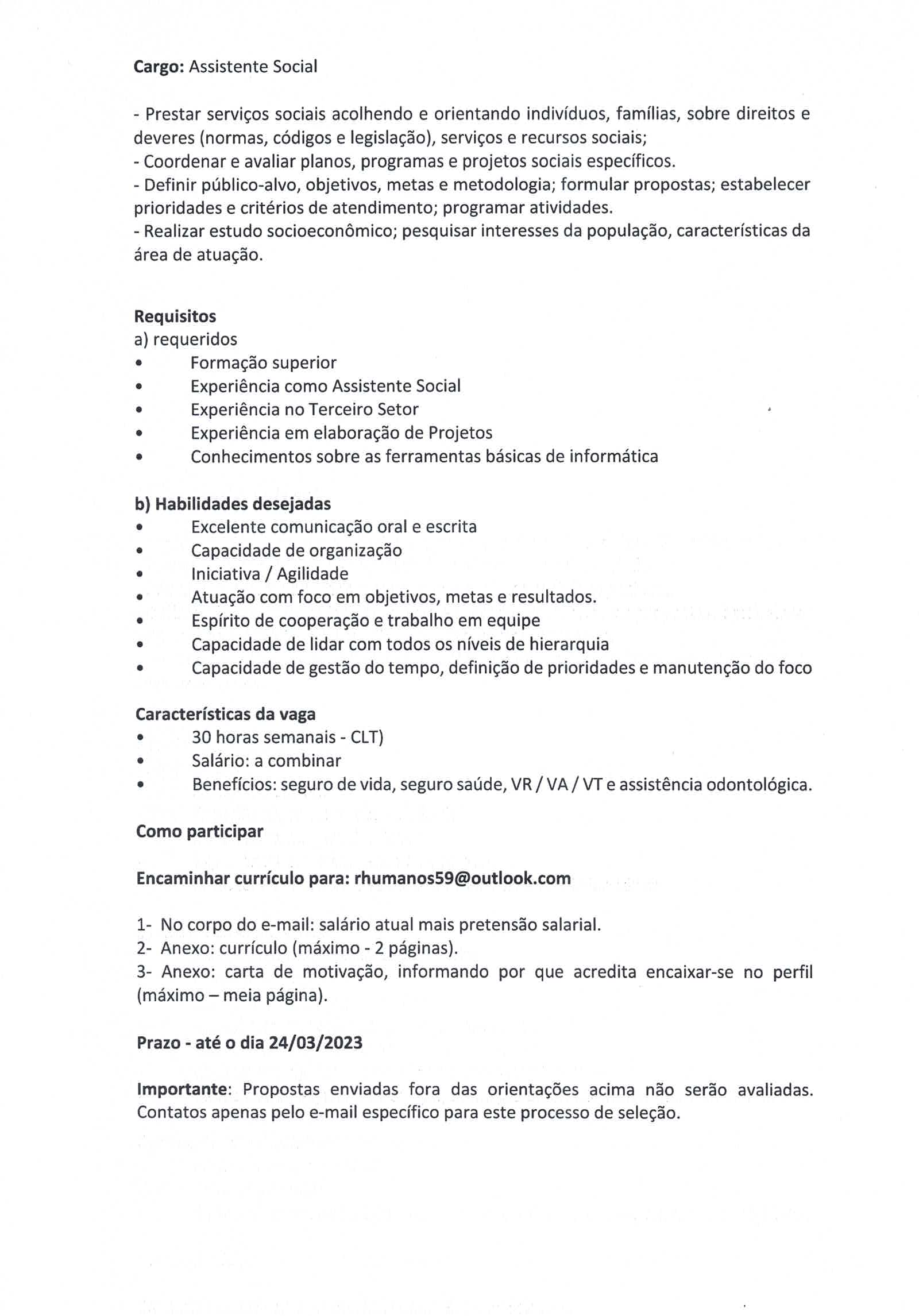 Escolaridade: Ensino Superior Completo na área de Humanas ou Saúde (EX.: Serviço Social, Psicologia Social, Gestão em Saúde Coletiva, etc). Exigências: experiência na função e na gestão administrativa de Projetos