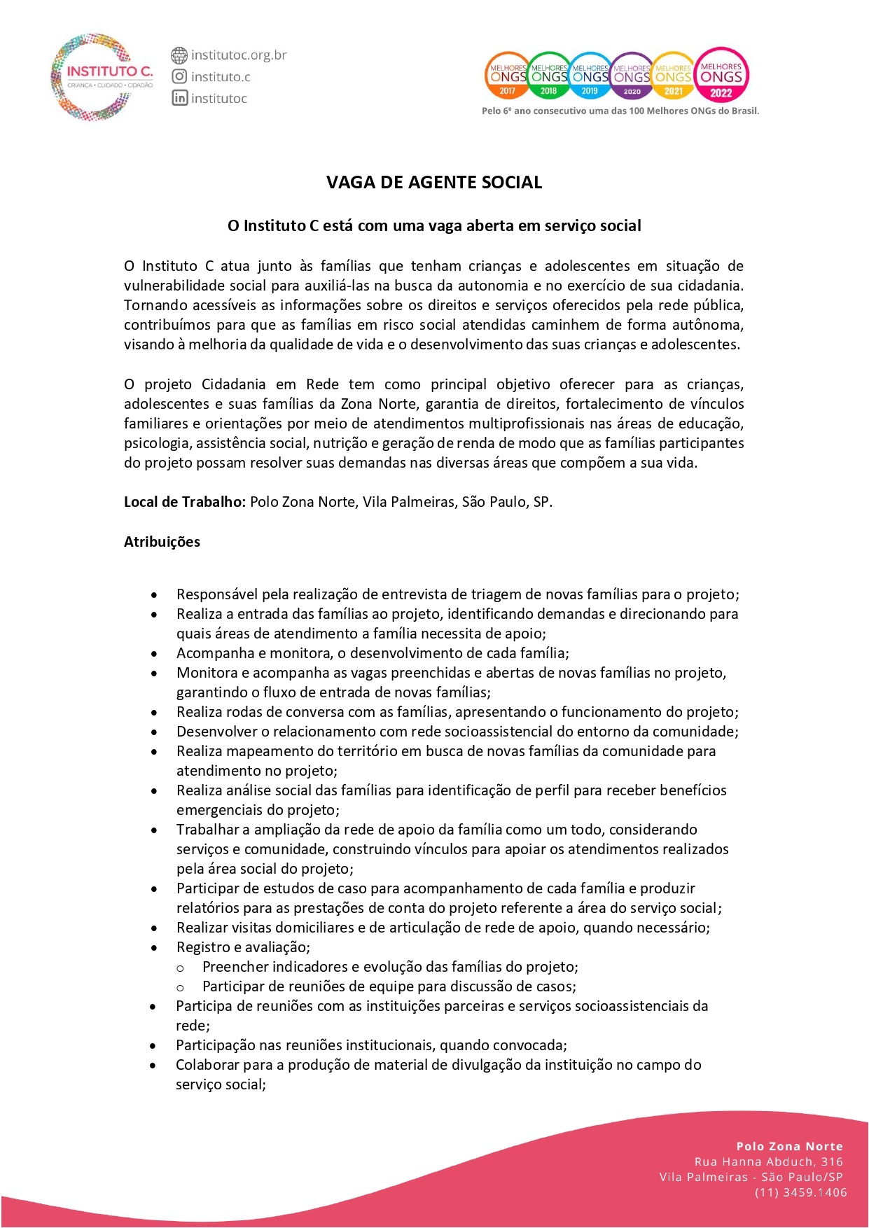 Atuar na área de Triagem e Monitoramento do projeto Cidadania em Rede, desenvolvido pelo Instituto C. Todo o trabalho é ligado diretamente com famílias com crianças e adolescentes, assistidas no