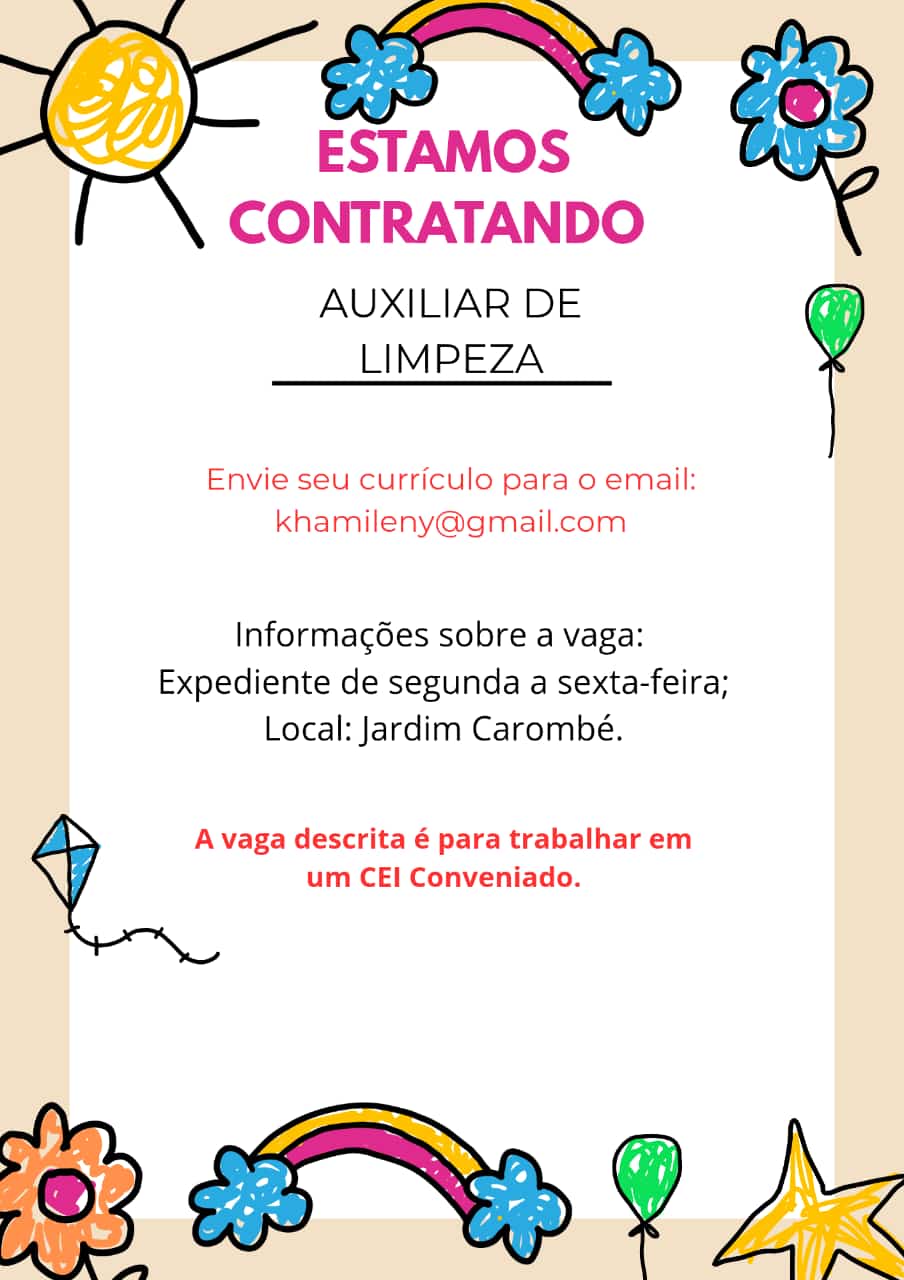 Auxiliar de limpeza 31 de janeiro de 202631 de janeiro de 2026 0 Comentários 17:19 Tempo Integral Jardim Carombé/Zona Norte Publicado 1 semana atrás CEI Conveniada https://www.canva.com/design/DAG__qRVAyU/hq2yul9gJ2I83JzoFj1eWA/edit?utm_content=DAG__qRVAyU&utm_campaign=designshare&utm_medium=link2&utm_source=sharebutton Para se candidatar a esta vaga envie seus detalhes por e-mail para khamileny@gmail.com